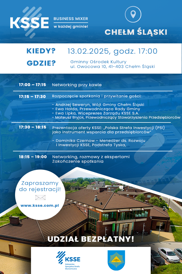 Rejestracja uczestników na stronie: https://www.ksse.com.pl/business-mixer-ksse-w-kazdej-gminie-chelm-slaski