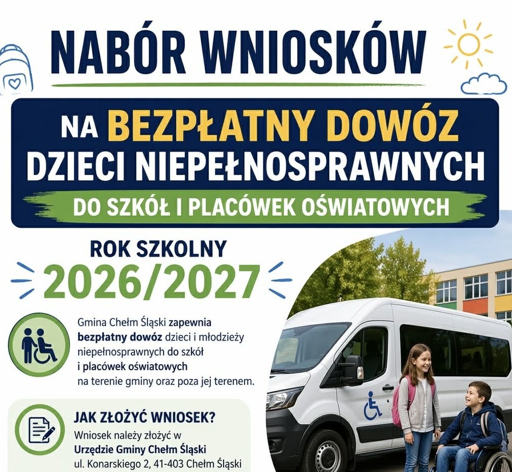 Gmina Chełm Śląski zapewnia dzieciom niepełnosprawnym bezpłatny transport i opiekę w czasie przewozu do najbliższego przedszkola, innej formy wychowania przedszkolnego, szkoły podstawowej, szkoły ponadpodstawowej i ośrodka, w których realizują obowiązek szkolny i nauki.